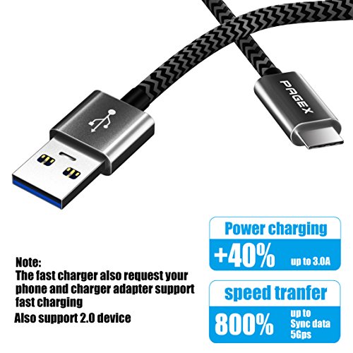 Use this Type C cable for Samsung Galaxy S8 and USB-C charger. Supports all USB C devices,Galaxy Note 8, LG V30,G6, G5,LG V20,New Macbook Nintendo Switch,Moto Z Z2,Note 8 charger, Googel pixel 2,Samsung Galaxy S8 Plus Google Nexus 5X/Nexus 6P/Pixel XL, Lumia 950/950XL, LG G5/SE/G6/V20, HTC 10, Huawei P9/Plus, Motorola Moto Z Force/Play, ZTE Zmax Pro, and other USB 2.0/3.0 Type-C devices. Charging & Data Transfer: Safe charging at up to 3A is ensured by high-standard components, including a 56k ohm resistor. USB 2.0 supports data transfer at up to 5Gbps Durable & Flexible Design: Durable, flexible PVC-coated A to C cables with slim, reversible USB-C connectors and 5000+ bend lifespan for easy connection Package Contents: PAGEX Two 6.6ft USB 3.0 A to C Cables.