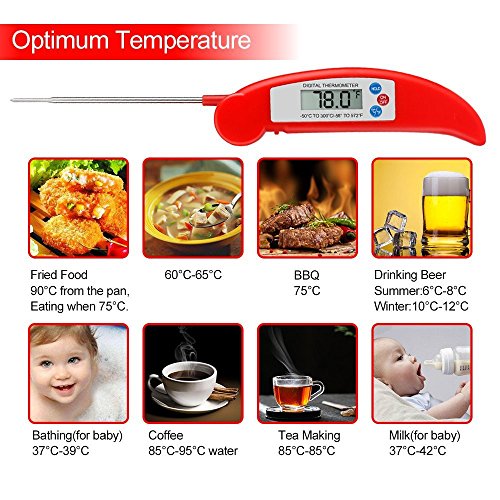 Customer questions & answers Question 1:What type of battery does this take? Answer:It takes AAA battery Question 2: Has anyone used this for candy making? Answer:Absolutely! . You could use the temperature probe to keep track of the temp, it suit for food, candy, cheese, water, soup, baby's milk, coffee,beer, all kinds for meat, bread etc. Question 3:How long will the thermometer take to auto off when forgot to fold the probe or shut off? Answer: 10 min High Performance Digital Meat Thermometer is a premium probe thermometer fit for both home and professional use. The meat thermometer is only need 4 second response time to read the temperatures. With an accuracy of ±1°F, instant read thermometer made of high-quality impact-resistant thermoplastics to prevent warping and cracking. The Digital Barbecue Thermometer can survive 4,000+ hours of continuous use on a single change of battery. A tiny 1.6mm tapered probe minimizes the puncture footprint on your food. An anti-microbial thermoplastic shell prevents bacterial growth. Specifications - Range of temperature: -58°F ~ 572°F (-50°C ~ 300°C) - Response Time: 4-5 seconds to within 1°F of final temperature in moving boiling water (212°F) - Accuracy: ±1°F - Battery : 1x AAA for easy replacement - Battery Life: 4,000+ hours - Auto-Off: 10 min - °F/°C Configurable: NOTE: To switch the Digital Thermometer on after auto-shutoff, fold in probe, wait a few seconds, then fold out probe.