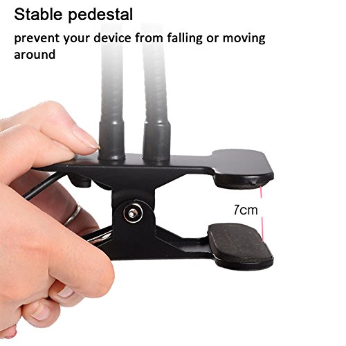 Cell Phone Holder with Selfie Ring Light The unit not only can be used as cell phone holder/clip on mount/phone clamp/mobile bracket/phone stand,but also can be treat as selfie ring light/ desk lamp/tablet lamp/reading lamp/bed lamp; Two gooseneck long arms & 360 degree roating ball make your moving freely as you like while live show;3 Light Modes & 9-Level Brightness,press the button on the dashboard to choose perfect light; This items with soft silicone pad on the clip & stable pedestal to prevent falling or moving around; This items fits all 2.3 In-3.15 In(Width) devices,no hesitate to store it. Specifications 3 Light Modes:cold, warm and mixed light 9-Level Brightness Width of the holder: 2.30 in-3.15 in /5.8cm-8cm Length:13.7 in/40cm (Holder) What will you get? 1 x Cell Phone Holder with Selfie Ring Light