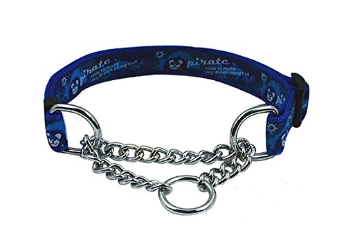 Strimm Adjustable Nylon Martingale Choke Collar with Pirate Printed Pattern for Large and Extra Large Breed Dogs 100% high grade quality nylon material with printed pirate pattern, durable and help to reduce the hair from becoming tangled. Premium welded steel with chrome plating, total weight : about 135g The adjustable choke collar adjusts for a neck size of 40cm -74cm, width 2.5cm, designed for large breeds