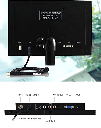 Product name:10.1 inch monitor Product model: HB1012 16:10display area:10.1 inch The best resolution: 1280X800 Brightness: 400 CD/m2 The refresh rate: 60-75 hz Signal input interface, VGA/AV/BNC/HDMI Colour: PAL. NTSC LED screen backlight: highlight The fuselage size: 252X165X36mm Function is optional: computer/monitor The menu language: a variety of Power supply: 12 v Standard accessories: power supply VGA line