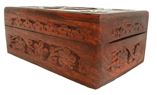 This handcrafted hardwood box features a central engraved pentagram surrounded by four solid brass pentagrams, complemented by deep floral carvings on all sides. Measuring 15cm x 10cm x 6cm, it offers a secure, hinged storage solution ideal for tarot cards, jewelry, or precious keepsakes—perfect for collectors and gift-givers seeking a blend of mysticism and craftsmanship.