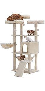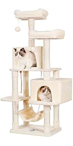 The Hey-brother Cat Tree is a 61-inch tall, multi-functional indoor cat tower crafted from engineered wood with a reinforced base for superior stability. Featuring padded beds, sisal scratching posts, interactive toy balls, and a cozy hammock, it caters to all your cat’s natural behaviors—climbing, scratching, playing, and resting. Covered in easy-to-clean high-quality flannel, this modern beige cat tree blends seamlessly into any home while providing a safe, engaging environment for cats of all life stages.