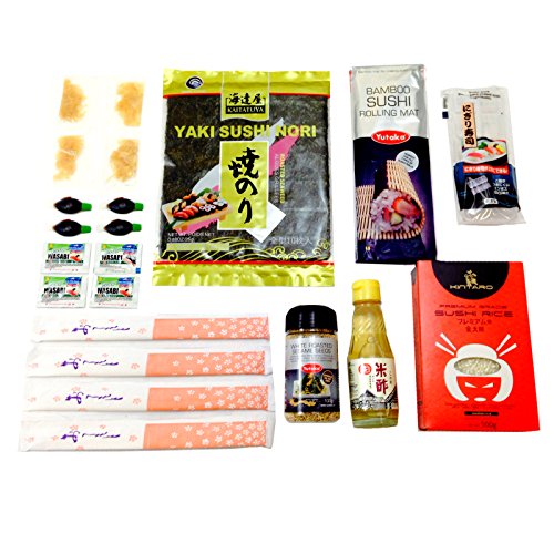If you want to have a great sushi party, then this is the best buy you could hope for. Thiscontains all the ingredients you need for your sushi party, for a fantastic price! HERE'S WHAT YOU GET: 1 x Bamboo Rolling mat 1 x Kintaro Sushi Rice 500g 1 x New Victory Nori Seaweed Sheets (10 pack) 4 x Pairs of Disposable Chopsticks 4 x 2.1ml Shoda Fish Shaped Japanese Soy Sauce 4 x Sachet of Pickled Gari (Sushi Ginger) 4 x Wasabi Paste Sachets 1 x Bottle of Rice Vinegar 100ml YTK White Sesame seed's 100g 1 x Nigiri Mould