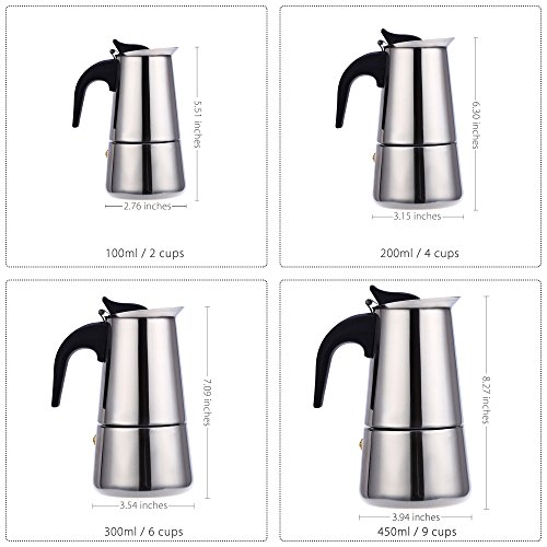 This espresso maker makes espresso making process becomes easier and enjoyable. It is used on gas or electric stovetops. Perfect for home, office and party use! Use Instructions: 1. Unscrew the 3 parts of your espresso pot, fill the base with water up to the level of the safety valve and insert the filter funnel. 2. Fill the filter funnel with finely ground coffee (do not press down), make sure there's no coffee powder left on the edge, then place it back to the lower chamber and screw the top and base together firmly. 3. Heat a few minutes on the heating device with a small / medium fire, the coffee slowly overflow into the upper. 4. Take the coffee pot away from the heating device, and then you can enjoy your coffee. Specifications: Material: stainless steel Capacity: 100ml Package weight: 0.358 kg Product Size(L x W x H): 7.00 x 7.00 x 14.00 cm / 2.76 x 2.76 x 5.51 inches Package Size(L x W x H): 10.50 x 9.00 x 16.00 cm / 4.13 x 3.54 x 6.3 inches Capacity : 200ml Product Size(L x W x H): 7.00 x 7.00 x 14.00 cm / 2.76 x 2.76 x 5.51 inches Package Size(L x W x H): 10.50 x 9.00 x 16.00 cm / 4.13 x 3.54 x 6.3 inches 300ml (Optional) Package weight: 0.559 kg Product Size(L x W x H): 9.00 x 9.00 x 18.00 cm / 3.54 x 3.54 x 7.09 inches Package Size(L x W x H): 12.50 x 9.50 x 21.00 cm / 4.92 x 3.74 x 8.27 inches 450ml Package weight: 0.717 kg Product Size(L x W x H) : 10.00 x 10.00 x 21.00 cm / 3.94 x 3.94 x 8.27 inches Package Size(L x W x H): 14.00 x 10.50 x 23.00 cm / 5.51 x 4.13 x 9.06 inches Package Contents: 1 x Mocha Espresso Percolator Coffee Pot 1 * Espresso Maker
