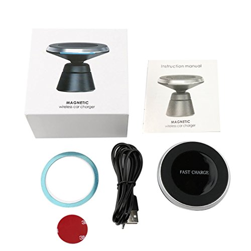 Function: The fast wireless car charger is magnetic, which can hold our phone well in place while driving. And a Qi wireless charging receiver is recommended. Specifications: Input power: DC 5V/2A 9V/1.67A Output: DC 5V/1.5A 9V / 1.3A. Dimension: 67mm*67mm Product weight: 80±2g Charging efficiency: 75% Cable length: 1m/ 3.28ft Certifications: QI, CE, FCC, OHS Indicator Light: Standby State: The Green indicator light flashes and then light go out; Charging State: The Blue indicator light is on; Abnormal State: The indicator light flashes. Package: 1 x Car fast wireless charger 1 x Cradle Mount 1 x USB Cable 1 x Metal ring 1 x User manual 1 x 3M sticker Notes: 1.Please note that wireless charger will not work if your phone case is over 2mm thickness. 2. Please connect this charger with full 1.5A output. Insufficient input current may cause unstable charging. 3. Sometimes the receiver coil in your phone is at the bottom and you have to adjust the position of your phone to get charged. 4. For phones that are not Qi enabled, wireless charging receiver is recommended. 5. Some mobile phone respond to a little slower when put on the charger, and please be advised that this due to the operating system.