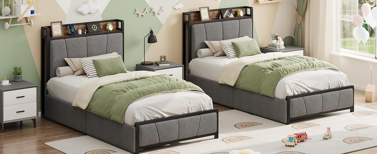 The GAOMON Twin Size Bed Frame combines rustic linen upholstery with practical design, featuring a storage headboard with fast USB and Type-C charging ports, two large under-bed drawers with customizable placement, and a sturdy metal slat frame supporting up to 800 pounds. No box spring needed, noise-free, and easy to assemble in about an hour, it’s the perfect blend of style, function, and comfort for modern living spaces.