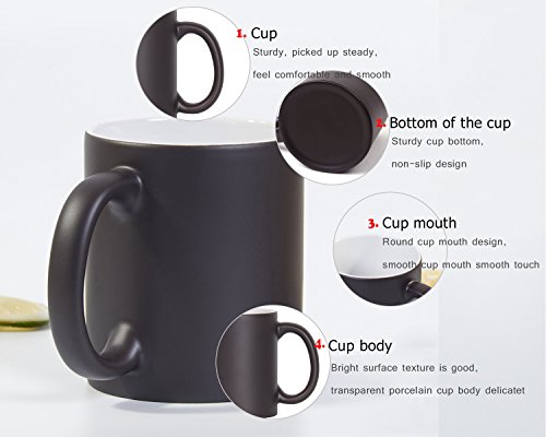 The Magic Color-Changing Coffee Mug - Theblack will fade and the pattern will appear after you pour hot liquid into themug.It is heat activated so it is madespecifically to react to hot liquid. You can pour in coffee, tea or even hotchocolate into the cup in order to activate it. After pouring in the hot liquidthe cup begins to change appearance! Slowly it will go from a black cup to a whitecup with beautiful pattern!The mug is made from the best ceramic mugsand sublimation inks, durable and environmental. Each mug is individuallyprinted on heat transfer paper, then perfectly applied to the mug by hand. It'sinserted into a heat press and baked at 1200 degree for the perfect amount oftime. Steady performance make it never peel or chip off. Simple shape andsmooth texture, the mug offers comfortable feeling for your hand and lips.Specification:- Remind function: you can judge thetemperature from the color of the mug, then decide drink or not. - Printing: Sublimation Printing will Not Chip or Fade.- Holds Up to 11 Ounces.- Size: 3.7" height x 3.2"outside diameter. - Care: Dishwasher + Microwave Safe.- Packaging: Comes Gift - Wraped in GiftBox with foam, 100% safe.Best Gift OptionIt is packaged well in a box which makes itsafe during the shipping way. The print of the mug is on both sides so it canbe seen either way. It is a great gift for Christmas, Birthday, Wedding Party,Valentine's Day, Anniversary, Father's Day, Mother's Day, Housewarming,Retirement, New Year's Day, College Graduation, St. Patrick's Day,Congratulations, Job Promotion, New Job, Stocking Stuffers and Secret SantaGifts, or just without any special reason. Treat yourself plus stock up foreveryone on your gift list.