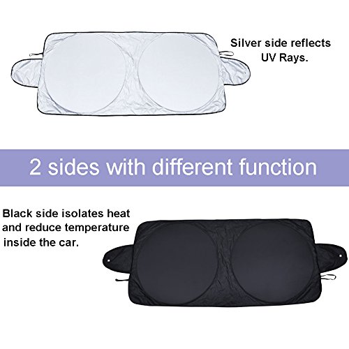 Specification: Brand: Power Tiger Car Accessories Item Condition: Brand new and high quality Color: Silver Material: high quality silver coated fabric with higher density Size: Classic Size 59" X 27", 150 X 70 cm. Weight: 150gFeatures: Protect your vehicle dashboard from cracking and fading by blocking the Sunlight. UV Ray Isolation: our car sun shade help reduce car interior temperature and keep inside car and your seats cool when you get off. Stay Cool: Keeping your vehicle steering and interior at the ideal temperature. Universal Size: Designed to fit most car, SUV and truck windshield.Newest Design - Our windscreen shades has flaps on both sides that you can close the door on, which keep itself pretty tight against the windscreen. Meanwhile, 2 bungee cords attached to both rearmirrors for securing this sunshade, so that it can't be blown away by wind. Pop-up Ready: Easy to open and easy to fold back in seconds.Package Included: 1 Windshield Sun Shades ( 150 X 70 cm ) 1 Premium Quality portable storage pouch ( 30 x 30 cm )