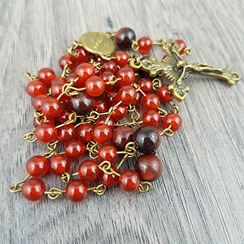 I wanted to bring the beautiful red of the red Tiger Eye stones out a little more and thought the best way to do this would be to place them next to the wonderful red of the Red Carnelian. The Tiger Eye stones have so much depth and vibrancy and these two gemstones together look exactly as I imagined in my mind before making them. Measurements: Please see the image included for a guide to measurements, the looped circumference piece is around 31/32" long. The vertical hanging piece from the top of the centrepiece to the bottom of the crucifix is 5.5". When laid out long and flat, the rosary is around 20/21" from top to bottom. This is a traditional Five Decade Rosary made with 6mm & 8mm Our Father gemstones. Post & Packaging: Each piece of jewellery will arrive in an elegant hand stamped eco-friendly kraft box, ready for you to keep it safe inside or for gift giving. Please see the image provided for an example. Your package will also include care instructions, a resealable storage bag, and an anti-tarnish tab for long term protection. Free Lifetime Repairs: Life can be tough on jewellery so if you ever need your jewellery repaired, for any reason, just get in touch and we can arrange for me to fix it for you. History & Lore: Carnelian Stones are thought by spiritual people to be stones of action, that will give you the confidence to move forward on a new path in life. It is used as a stabilising crystal, for anchoring in the present. It's said that it's high energy helps restore lost vitality and motivation, and stimulates creativity for new pursuits. Carnelian is associated with the Element of Fire and it is a stone of Taurus. Tiger's Eye has been revered by people since 5000BC in Mesopotamia through Roman and Egyptian times. Tiger's Eye is traditionally thought to give you courage, will power and self confidence. They are also thought to bring prosperity, often in the form of money.