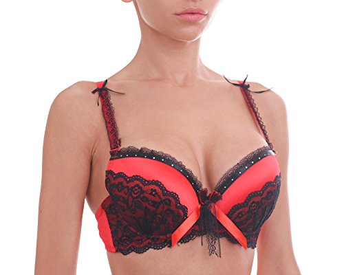 Gorgeous superboost bra set with thong. Heavy padding adding up to one size. Crystals, lace and satin for luxury style. Very elastic material to fit perfect. Great for special nights or for everyday use. Adjustable and removable straps. Can be worn multiway