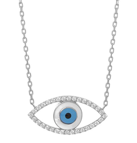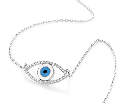 Celebrity Inspired Designer Evil Eye Necklace. 925 sterling silver with diamond simulated high grade cubic zirconia stones and enamel lucky eye. It can be adjusted both 15.7 (40cm) or 17.7 inch (45cm) with the additional extender chain. Number of different celebrities have begun to wear the evil eye jewelry for many different reasons. The evil eye jewelry has really become popular since the biggest stars have been spotted sporting the jewelry. The evil eye trend in jewelry spotted on celebrities such as Shakira, Brooklyn Decker, Madonna, Nicole Richie, Kelly Ripa ,Caroline Manzo,Rihanna, Naomi Campbell and Hilary Duff has taken on a new look! It's designed to protect you from any jealousy. And of course there's a lot of jealousy, especially when you're on TV. You have a lot of eyes [on you] and sometimes not everyone's wishing you well. Width: 0.87" (2.20cm) Height: 0.39" (1cm) Weight: 0.12oz (3.30gr)
