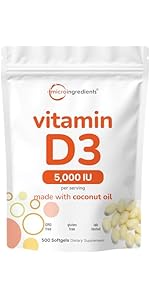 Micro Ingredients Vitamin D3 delivers a powerful 5,000 IU dose of pure cholecalciferol in 500 virgin coconut oil softgels, ensuring maximum absorption and easy daily use. This non-GMO, allergen-free supplement supports bone strength, immune defense, and heart health, backed by rigorous third-party testing and glowing customer reviews.